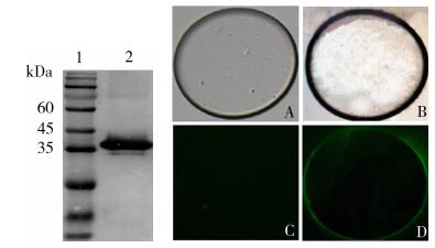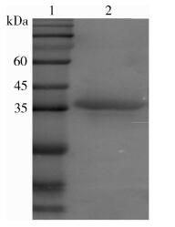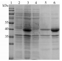菌株经小量诱导优化后表明,蛋白表达量在28 ℃、0.6 mmoL·L-1IPTG条件下达到最优,且主要以包涵体的形式存在(图 3)。SDS-PAGE结果显示诱导后菌体相对于诱导前,40 kDa处出现1条明显的表达条带。