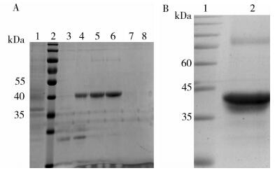 大量诱导超声破碎后获得包涵体沉淀,上镍柱,经咪唑梯度洗脱,洗脱液样品SDS-PAGE证明200 mmol·L-1咪唑将目的蛋白洗脱下来(图 4:A),因此,将200 mmol·L-1洗脱收集液用透析袋尿素梯度复性,收集复性后的蛋白,定量后-80 ℃保存,SDS-PAGE凝胶电泳显示其大小约为40 kDa,纯度达到90%以上(图 4:B)。