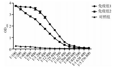 第三次免疫后第14天,采用耳缘动脉与颈动脉放血法放血,分离血清,再通过ELISA法确定抗血清效价,以免疫前血清为阴性对照,抗体效价可达到1: 409 600(图 6)。