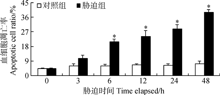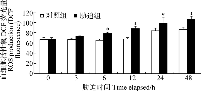 ROS含量的变化趋势和血细胞凋亡率较为一致(图 2),在胁迫后的3 h,ROS含量无显著变化(P>0.05),在胁迫后的6~48 h,ROS的含量显著升高(P<0.05),在48 h由对照组的86.32上升到106.31。