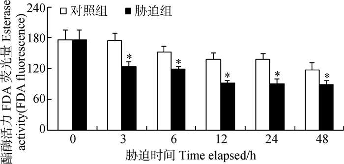 酯酶活性在胁迫后的3~48 h都呈显著下降的趋势(P<0.05),最低值出现在48 h,由对照组的117.78下降到88.40(图 4)。