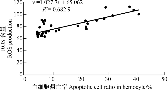 | 图 5 ROS含量和血细胞凋亡率的相关性(n=36) Fig. 5 Correlation between ROS production and apoptotic cell ratio (n=36) |