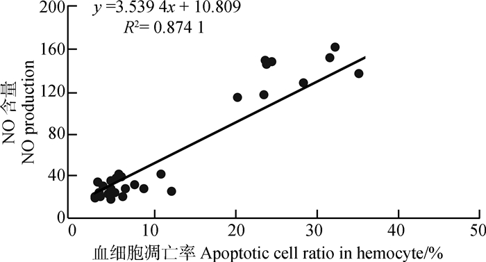 在胁迫48 h后,NO含量与血细胞凋亡率呈显著正相关(P<0.001),Pearson相关性系数为0.93(图 6)。