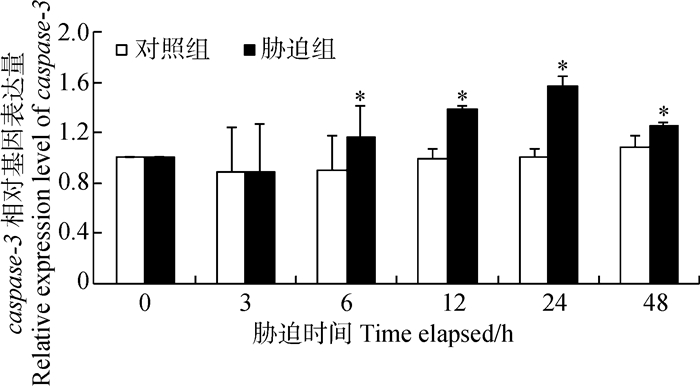 在胁迫后的3 h,Cu2+对罗氏沼虾caspase-3的相对基因表达量无影响,在胁迫后的6~48 h,caspase-3的相对基因表达量均显著增加(P<0.05),并在24 h达到最高值,由对照组的1.01增加到1.56(图 7)。