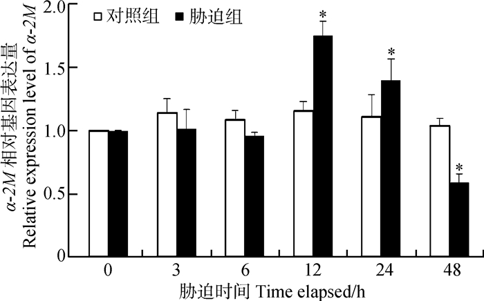 在胁迫后的0~6 h,Cu2+对罗氏沼虾α-2M基因表达量无影响,在胁迫后的12 h,α-2M基因的表达量显著升高(P<0.05) 并达到峰值,24 h时有短暂的降低,但与对照组相比仍有显著增加的趋势(P<0.05),在48 h,α-2M基因的表达量显著降低(P<0.05)(图 8)。
