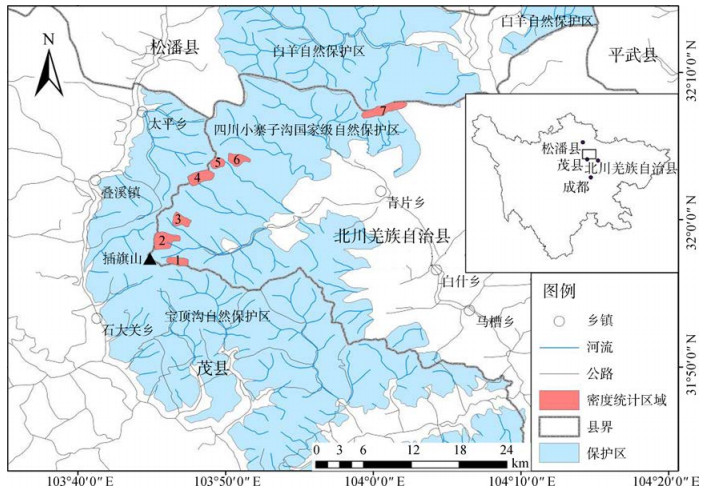 1 研究地点研究区域位于岷山山系中部的四川小寨子沟国家级自然保护区及其周边区域(103°45′~104°26′E,31°50′~32°16′N),总面积约1 920 km2。研究区域地形复杂,山地切割剧烈,属于北亚热带湿润季风气候类型,最高海拔4 769 m,年均温9.2 ℃,无霜期较短(4—10月),年日照1 527.5 h,年均降水量约800 mm,集中在7—9月(陈光升等,2005)。研究区域的植被带谱明显,4 100 m以上主要为高山流石滩植被;3 600~4 100 m为高山草甸植被,常见植物有橐吾Ligularia sibirica、宽叶韭Allium bookeri、扭盔马先蒿Pedicularis davidii、珠芽蓼Polygonum viviparum、金莲花Trollius sp.、紫羊茅Festuca rubra、羊茅F. ovina等;3 300~3 600 m主要为灌丛植被,以杜鹃Rhododendron spp.、金露梅Potentilla fruticosa、香柏Sabia pingii var. wilsonii等植物为建群种;2 500~3 300 m为以岷江冷杉Abies faxoniana、冷杉A. fabri等为主的亚高山常绿针叶林植被(卢汰春等,1986;张泽钧等,2003;罗辅燕,2005)。