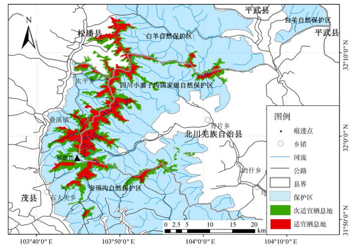 根据MaxEnt模型对绿尾虹雉繁殖期适宜栖息地分布分析,确定适宜最佳断点和次适宜阈值分别为0.130和0.025。因此将栖息地重分类为3类:0<HSI<0.025为不适宜栖息地,0.025<HSI<0.130为次适宜栖息地,0.130<HSI为适宜栖息地。对MaxEnt预测栖息地分布结果重分类后,将较小斑块进行融合,得到绿尾虹雉繁殖期栖息地分布图(图 4)。