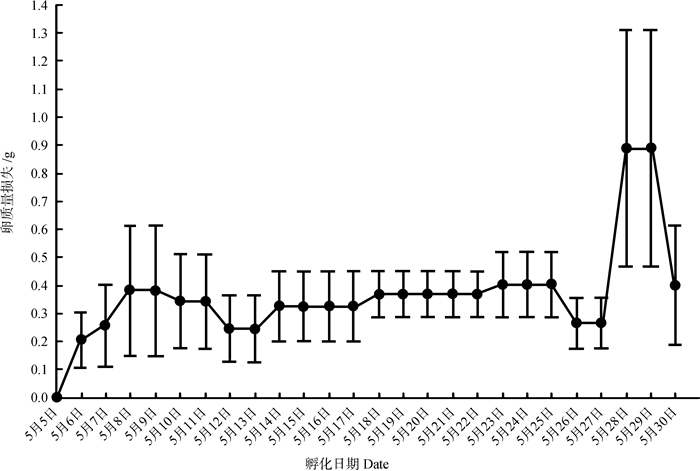 从5月5日开始孵化到5月30日卵破壳止,孵化期卵质量损失9.50 g±1.45 g (7.0~11.6 g)(图 1),损失率为15.82%±1.94%(12.24%~19.46%)。