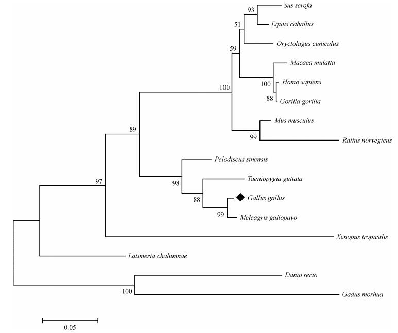 尽管GPR161基因序列信息目前只在人、小鼠、斑马鱼和家鸡中得到鉴定,但是随着测序技术的发展和越来越多物种的基因组被破译,不同物种中未经实验数据验证的GPR161基因预测序列或片段也能够从Ensemble数据库获得。为了更加全面地探究GPR161基因在不同物种间的分子遗传学进化,分子系统进化树结果显示,家鸡与火鸡Meleagris gallopavo的同源性最高,且与爬行类中华鳖Pelodiscus sinensis、鸟类斑胸草雀Taeniopygia guttata分子进化关系也较为接近,人和小鼠次之,与斑马鱼进化关系则相对较远(图 3)。