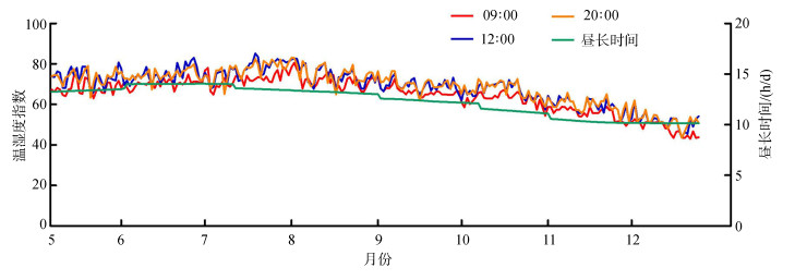 | 图 1 豚鹿圈舍温湿度指数和昼长时间 Fig. 1 The trend of temperature-humidity index in breeding houses of Axis porcinus and daylength |