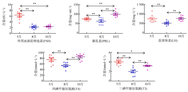分析发现,8月豚鹿血清中T3、T4的含量极显著低于5月、10月(P<0.01)。LH、PRL的含量在8月均极显著下降(P<0.01),在10月极显著回升(P<0.01)。FSH在8月的含量极显著低于5月(P<0.01),但与10月的差异无统计学意义(P>0.05)(图 2)。