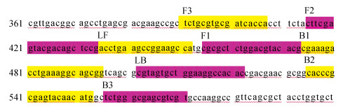 | 图 1 环介异等温扩增技术引物在oprL基因的位置(GenBank登录号:Z50191.1) Fig. 1 The position of loop-mediated isothermal amplification primers in oprL gene(GenBank accession number: Z50191.1) |