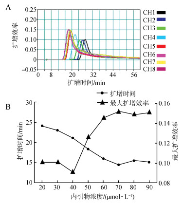 在内引物浓度为70 μmol·L-1时,反应体系在15 min左右开始扩增,此时的最大扩增效率较高,并且达到最大扩增效率用时相对较短,因此将70 μmol·L-1判定为反应的最佳内引物浓度(图 3)。