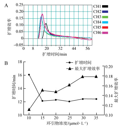 在环引物浓度为30 μmol·L-1时,反应体系在12 min左右开始扩增,此时的最大扩增效率较高,并且达到最大扩增效率用时较短,故将30 μmol·L-1判定为反应的最佳环引物浓度(图 4)。