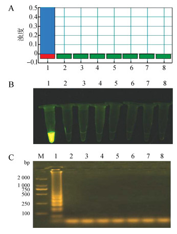 | 图 5 环介导等温扩增技术(LAMP)检测的特异性 Fig. 5 Specificity of loop-mediated isothermal amplification (LAMP) assay A.不同菌株的LAMP鉴定,B.荧光鉴定图,C.琼脂糖电泳图;1.铜绿假单胞菌DNA,2~7分别为鼠伤寒沙门氏菌、甲型副伤寒沙门杆菌、嗜肺巴斯德杆菌、肺炎克雷伯杆菌、金黄色葡萄球菌ATCC25923和CMC6003的DNA,8.空白对照,M. DL2000 DNA Marker A.product identification by LAMP, B. sample fluorescence, C. agarose gel electrophoresis of reaction products; lane 1. Pseudomonas caeruginosa DNA product, lanes 2-7. Salmonella typhimurium, Salmonella paratyphoid A, Pasteurella pneumotropica, Klebsiella pneumoniae, Staphylococcus aureus ATCC25923 and CMC6003 DNA products, 8. control, M. DL2000 DNA Marker |
