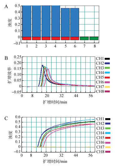 | 图 6 环介导等温扩增技术(LAMP)检测的稳定性 Fig. 6 Stability of loop-mediated isothermal amplification (LAMP) assay A.样本的鉴定,B. LAMP扩增效率,C.样本浊度;1~6为不同批次不同时间提取的铜绿假单胞菌的DNA样本,7、8为空白对照 A.product identification, B. LAMP amplification efficiency, C. sample turbidity; 1-6 indicate the different batches at different times of Pseudomonas aeruginosa DNA product, 7 and 8 represent the negative control |