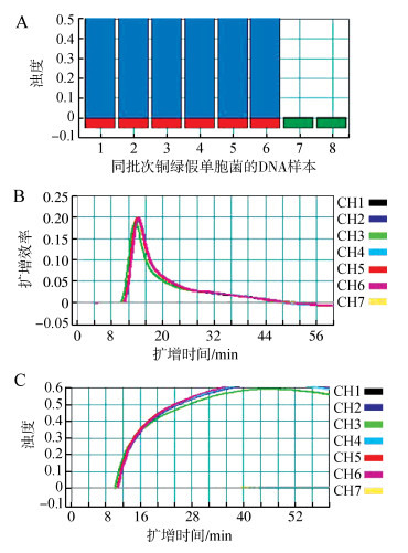 | 图 7 环介导等温扩增技术(LAMP)检测的重复性 Fig. 7 Repeatability of loop-mediated isothermal amplification (LAMP) assay A.样本的鉴定,B. LAMP扩增效率,C.样本浊度;1~6为同批次的铜绿假单胞菌的DNA样本,7为空白对照,8为空信号通道 A.product identification, B. LAMP amplification efficiency, C. sample turbidity; 1-6 indicate the same batch at different times of Pseudormonas aeruginnosa DNA product, 7 represents the negative control, 8. null |