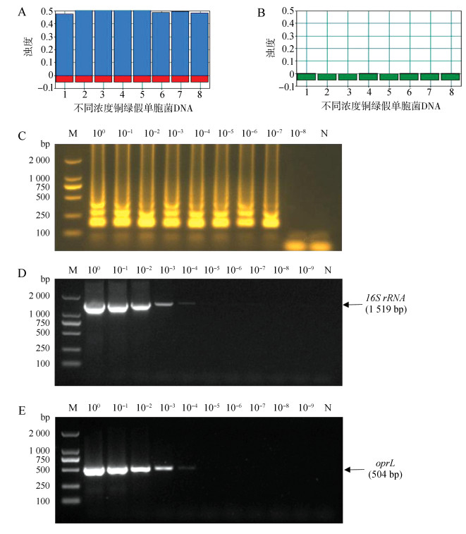 梯度稀释后的铜绿假单胞菌DNA用LAMP和PCR方法检测,其最低检测浓度分别为2.9×10-7 μg·mL-1(图 8:A~C)和2.9×10-4 μg·mL-1(图 8:D、E)。