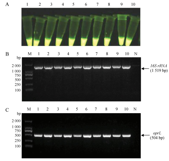| 图 9 小鼠血清样本检测结果 Fig. 9 Detection results of mouse serum samples A.环介异等温扩增技术反应阳性结果(1~10为阳性样本);B. 16S rRNA PCR凝胶电泳图(M为DL2000 DNA Marker,N为阴性对照);C. oprL PCR凝胶电泳图(M为DL2000 DNA Marker,1~10为阳性样本,N为阴性对照) A. fluorescence result of loop-mediated is othermal amplification (lanes 1-10. positive samples); B. agarose gel electrophoresis of 16S rRNA PCR amplification (M. DL2000 DNA Marker, lanes 1-10. positive samples, lane N. negative control); C. agarose gel electrophoresis of oprL PCR amplification (M. DL2000 DNA Marker, lanes 1-10. positive samples, lane N. negative control) |