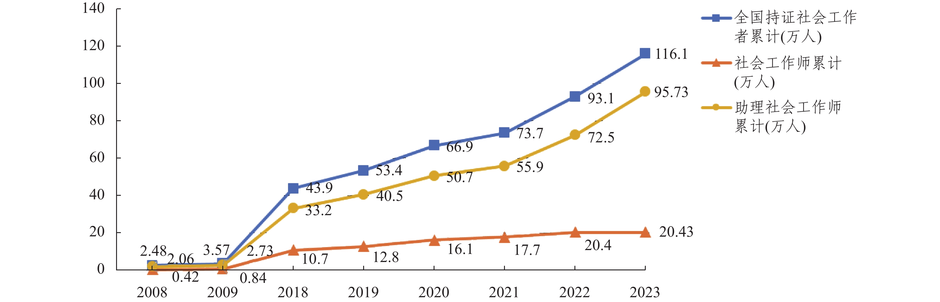 图 1 2008—2023年全国累计持证社会工作者变化趋势