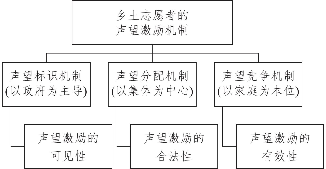 这种“通用性声望”之所以能有效激励广大乡土志愿者,是三种机制作用的结果。其一是声望的标识机制。该机制为志愿服务中的声望激励奠定了可见性基础,使城乡居民都能对志愿参与带来的声望激励可见、可感。其二是声望的分配机制。该机制为志愿服务中的声望激励提供了合法性保障,使居民真正认可声望的评判规则及其价值理念。其三是声望的竞争机制。该机制为志愿服务中的声望激励注入了持久性动力,使声望激励机制与农村社会相适应,得以持续维系自身的再生产。以此观之,声望的标识机制和分配机制负责解决的是“志愿服务中的声望激励何以可能”的问题,而声望的竞争机制负责解决的则是“志愿服务中的声望激励何以长期有效”的问题。以上构成了本文的基本分析框架(见图1)。下文将对上述三种机制的运作机理进行分析。