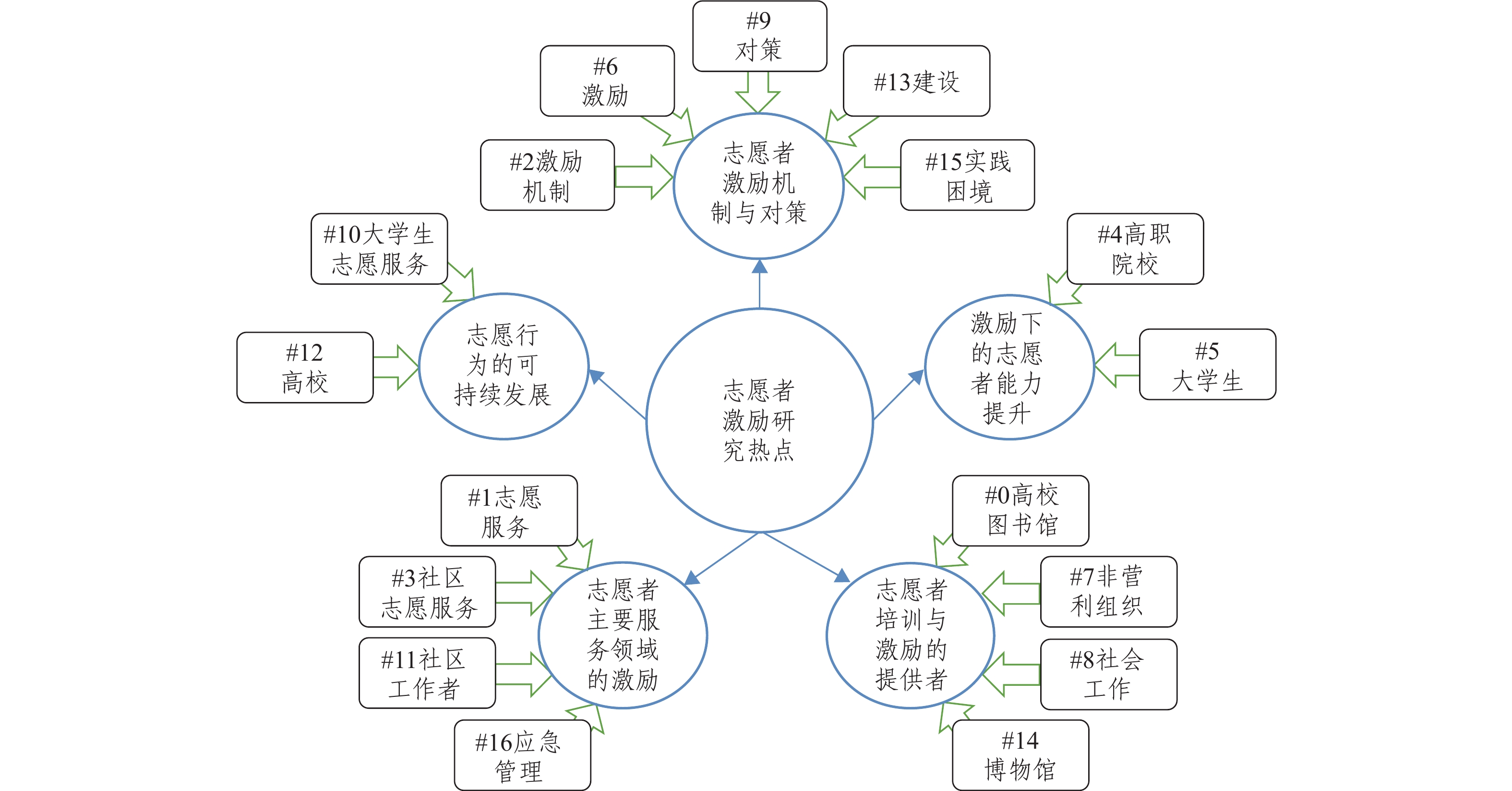 对17个聚类进行分析后,归纳出“志愿者培训与激励的提供者”“志愿者主要服务领域的激励”“激励下的志愿者能力提升”“志愿者激励机制与对策”“志愿行为的可持续发展”共5个主题(见图5),具体分析如下。