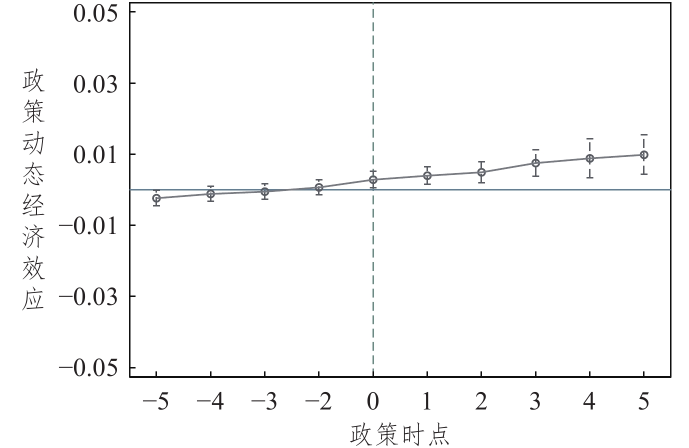 进一步地,对上面多期DID的做法进行平行趋势检验,结果如图2所示。可以看出在跨境电商综试区政策实施之前,政策回归系数置信区间包括0值,说明实验组和对照组的共同富裕水平具有相似的变化趋势,满足平行趋势假设。而在政策实施当期和政策实施之后,政策回归系数的置信区间不包括0值,趋势发生显著变化,说明跨境电商综试区的设立对当地数字贸易发展的影响是存在的,有利于促进地区共同富裕水平提高。