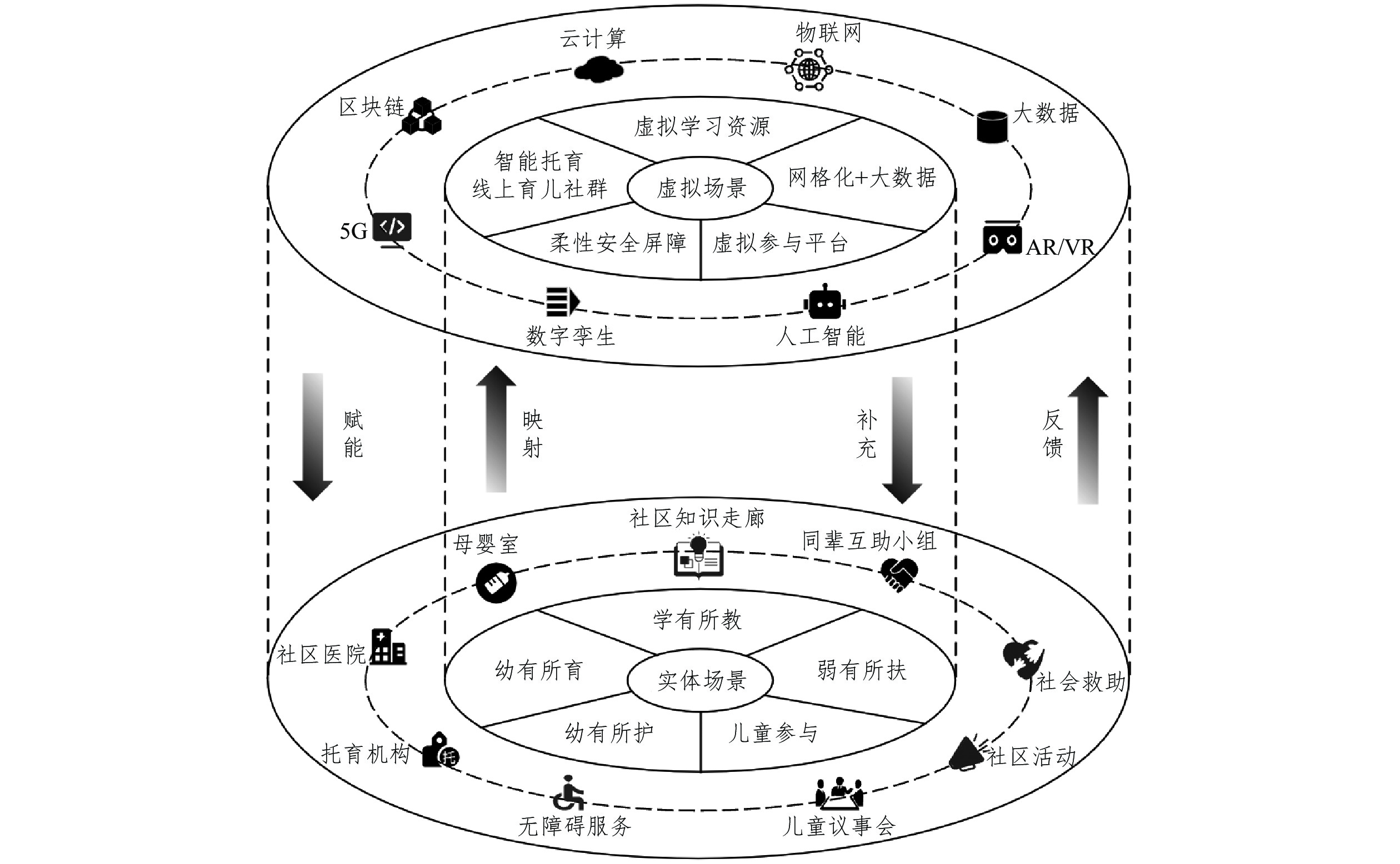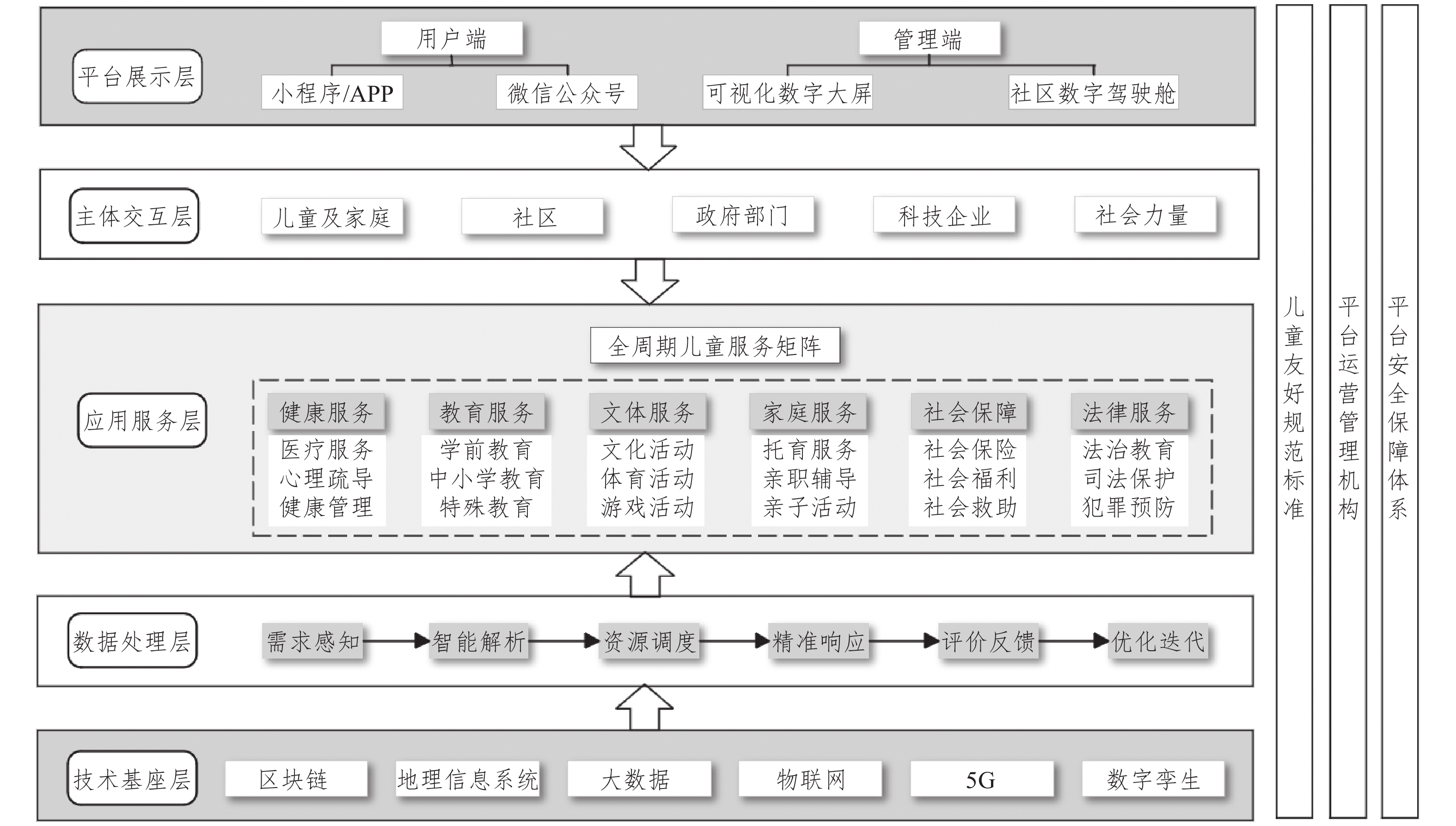 外层系统是儿童不直接参与,但对儿童发展产生间接影响的场域。在数智时代,外层系统的内涵演化为“响应儿童需求的数智化调控中枢”。其数智赋能的实践逻辑在于打造一个上下联动、左右互通的儿童友好数智平台。整合分散的政府政策、企业技术和社会组织资源,同时汇聚、解析并响应儿童及其家庭在微观系统互动中产生的需求信号和行为数据,通过全链条赋能弥合儿童需求与服务供给间的结构性鸿沟。需要说明的是,虽然儿童不直接参与平台运作,但平台的核心使命是服务于儿童,其设计逻辑、运行目标和评价标准均服务于儿童发展。平台依托技术手段进行数据归集与资源调度,将深刻影响儿童可获得的社区服务体验。因此,外层系统的数智平台本质上仍是围绕儿童需求运转的间接环境。