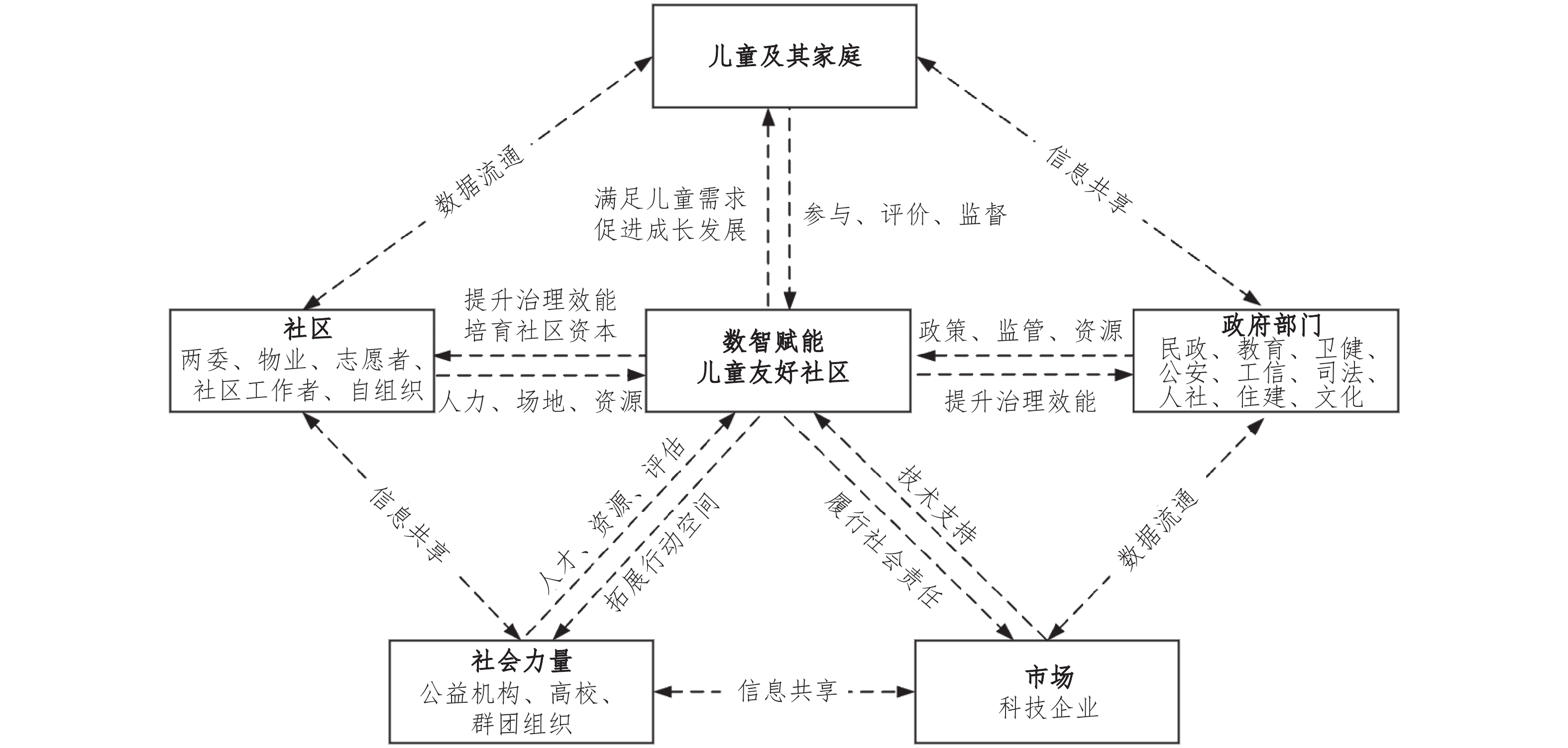 从组织架构来看,儿童及其家庭、社区、政府、社会和市场是儿童友好社区数智生态系统中的五大主体要素(见图2)。其中,儿童及其家庭是儿童友好社区建设的出发点和落脚点。其既是需求表达者、共治参与者,也是建设成效的受益者、评价者和监督者。社区党委和居委、物业、志愿者和社区工作者是社区层面的重要组织者和参与者。他们通过发挥在地化优势,能够高效整合人力、场地及实体资源,承担数智技术向适儿服务转化的功能。由民政、教育、工信、公安、司法、人社、住建、文化、卫生、体育等政府部门构成的行政力量,承担政策供给、资源统筹和监管保障职能。代表市场力量的科技企业,凭借其独有的技术优势、数据资源和创新能力,嵌入儿童友好社区生态圈,扮演技术支持者的角色,在技术应用场景中履行社会责任。而代表社会力量的高校、公益机构、行业协会等,在人才、咨询、评估等方面提供专业支撑,在此过程中既能够扩展自身公共行动空间,又能有效弥补政府的技术盲区与市场的社会性缺失,是社会层面重要的智库。