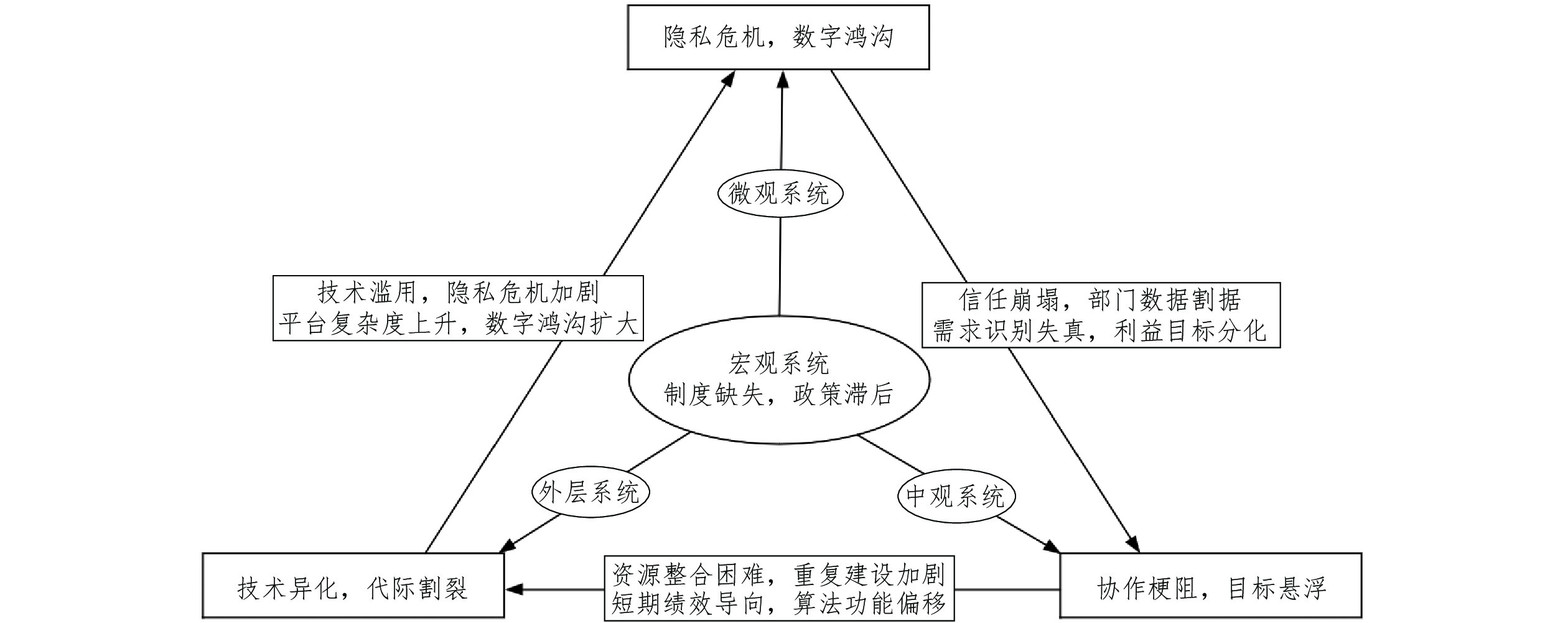 总结而言,数智赋能儿童友好社区建设的现实隐忧是一个嵌套式、系统性难题(见图4)。微观系统层面的“隐私危机”侵蚀信任基础、抑制参与意愿,“数字鸿沟”导致特定群体的需求数据缺失,二者共同削弱了技术赋能的普惠根基。这些基础性问题进而诱发了中观系统层面的“协作梗阻”,表现为数据割据、难以共享,以及“目标悬浮”导致协同动力不足。中观系统协同失效叠加微观系统数据缺陷,共同催化并延伸至外层系统,阻碍了资源优化配置与跨场景协同效能的发挥,催化了外层系统层面“技术异化”与“代际割裂”的困境。而上述问题的深层根源在于宏观系统层面制度设计的滞后与保障体系的薄弱。各层级隐忧相互交织、层层传导,共同构成了制约数智技术赋能成效的陷阱。