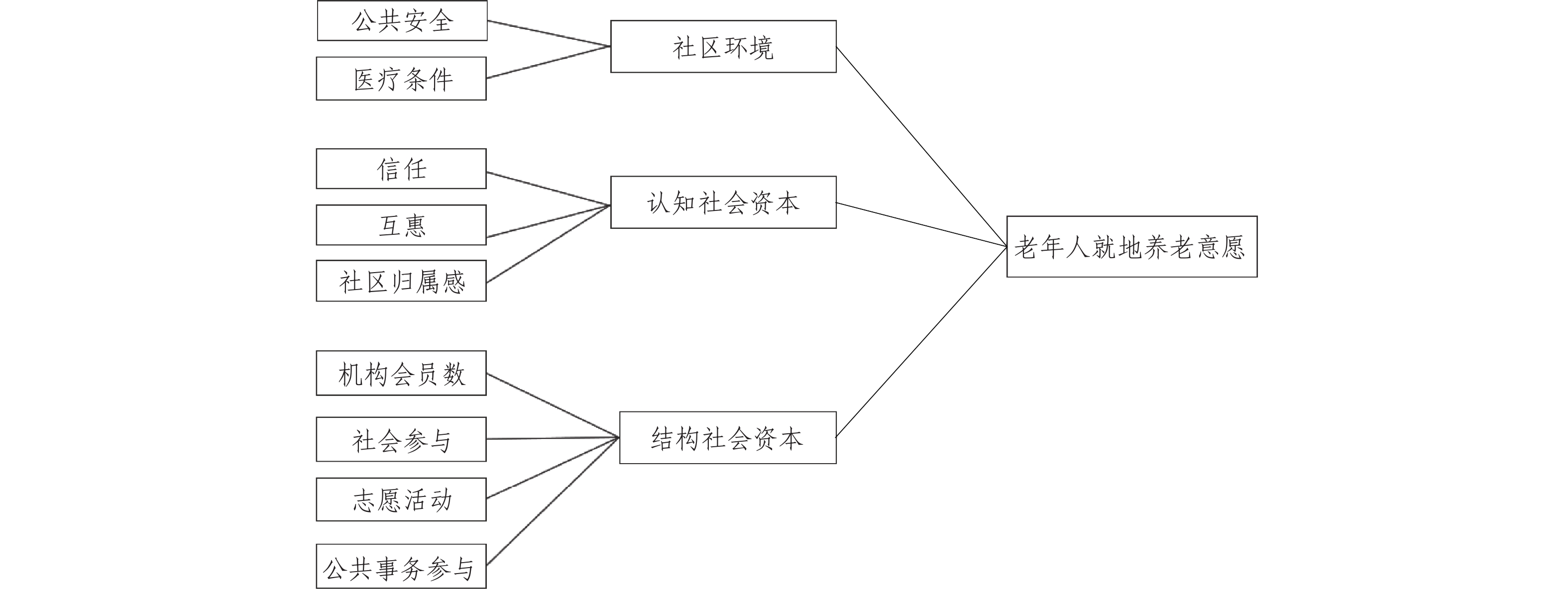 社会资本理论认为,社会资本作为嵌入社会系统的社会支持资源,是老年人就地养老意愿的一个重要保护因素。[4,26,34]老年人所处社区社会网络中的社会资本能够增强其获取护理服务、开展社会互动、获得非正式和正式支持以及实现团结协作的能力,这些有助于老年人继续留在原社区生活。[19]例如,在认知社会资本方面,社区信任能够增强老年人的熟悉感和安全感,促进其社会交往及互惠互动。这些是满足老年人日常护理和情感交流需求的资源。在结构社会资本方面,社区活动中的社会参与可以为老年人提供情感联结和归属感。在社会资本水平高的社区,居民更愿意为年老体弱者提供支持。总体而言,尽管部分老年人面临经济收入偏低、健康状况恶化等不利条件,但是高水平的社会资本能够转化为重要的社会资源,并提供有利的环境,使老年人得以留在原社区生活。因此,社会资本不仅直接影响老年人的生活质量,也是影响其就地养老意愿的关键因素。本文将重点探究社会资本与老年人就地养老意愿的关系。
