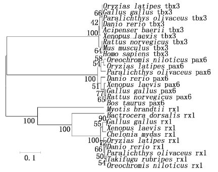 The phylogenetic tree of pax6,tbx3 and rx1