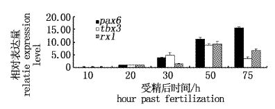 2.2 牙鲆胚胎pax6、tbx3和rx1基因定量表达利用荧光定量PCR检测牙鲆胚胎发育过程pax6、tbx3和rx1基因的表达量(图2),发现pax6在受精后10 h原肠胚早期没有表达,受精后20 h神经胚期才开始表达,之后其表达量逐渐加强;tbx3在受精后20 h开始表达,受精后50 h尾部游离期前表达量逐渐增强,而后减弱;rx1在受精后20 h开始表达,随后持续表达,表达量逐渐增多,在75 h开始减弱。