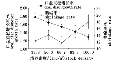 图 2 不同培育密度下海葵口盘直径增长率与个体萎缩率 Fig. 2 The average daily growth rate of sea anemone oral disc and shrinkage rate of sea anemone in different density |