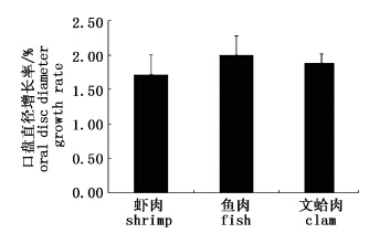 中华仙影海葵营挖掘型生活方式,固着于泥砂中,自然个体用触手捕获经过其捕食范围内的鱼虾贝类等活体饵料。海葵通过触手捕获麻痹猎物,进而通过口盘送入消化咽腔内进行消化汲取营养物质,从而达到获得生长能量的目的。消化残物隔日会从海葵口盘排出。对中华仙影海葵亲体驯养的初步研究表明,在鱼肉、虾肉、文蛤、白虾、河蟹、海蟑螂和泥螺活体饵料中,除海蟑螂和河蟹基本不摄入外,其他饵料均可作为海葵个体生长发育饵料来源[12]。本实验中,采取投喂等量新鲜鱼肉、虾肉和文蛤肉的措施,比较了不同饵料投喂对中华仙影海葵个体生长的影响。实验结果表明:投喂等量新鲜饵料的前提下,鱼肉和文蛤肉组都能获得较高的口盘直径增长率,不同饵料对海葵个体口盘增长影响差异不显著(P>0.05)。