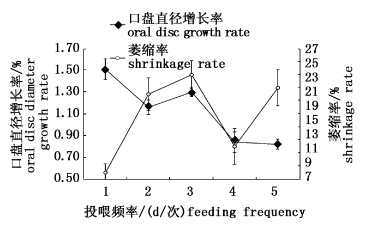 图 4 不同饵料投喂频次下海葵口盘直径增长率与萎缩率 Fig. 4 The average daily growth rate of sea anemone oral disc and shrinkage rate with different feeding frequency |