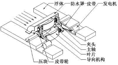 1 叶片式海流能发电装置结构 1.1 发电装置结构叶片式海流能发电装置包括浮体、防水罩、皮带、发电机、夹头、主轴、叶片、导向机构、皮带轮、压块,在导向机构的作用下,叶片在工作过程中始终保持垂直于水面(图 1)。