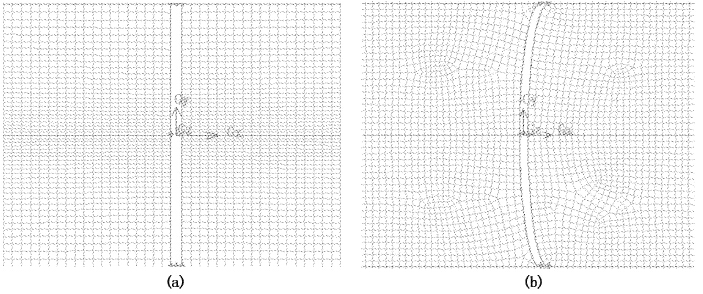 本模型利用GAMBIT软件对计算域进行分块式网格划分[8]。对于Ⅲ、Ⅳ、Ⅴ、Ⅵ区域,平板型叶片采用结构化网格(图 4a)。外凹型和内凸型叶片由于形状较为不规则,采用非结构化网格(图 4b)。其他区域的网格仍采用结构化网格。