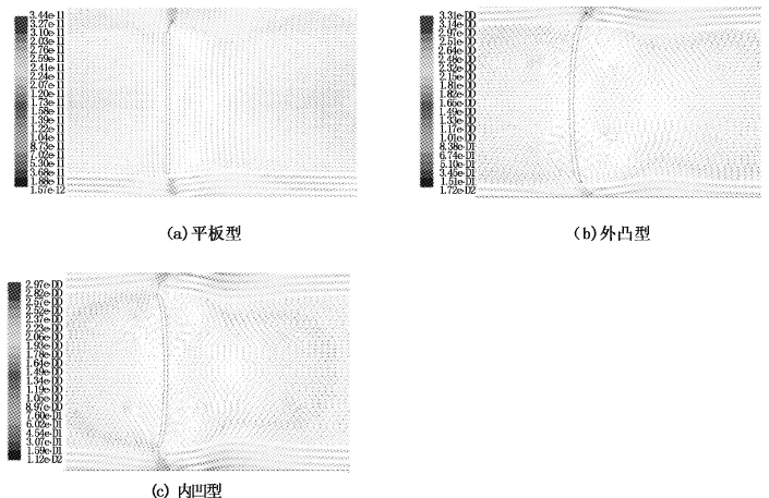 3.1.2 不同形状叶片速度比较分析相对于第一、二类叶片,第三类叶片的低速区区域影响范围较小,速度恢复较快。绕流之后,叶片的背壁后方区域,第一类平板型叶片的速度矢量变化最小,相对最稳定(图 5)。