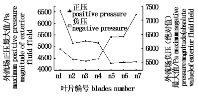 3.2.3 不同形状叶片压力最大值比较分析由图 8可知,相对于第一、二类叶片,第三类内凹型叶片外流场正压最大值最大,第二类外凸型叶片外流场正压最大值最小。第一类平板型叶片外流场负压最大值最大,第三类内凹型叶片负压最大值最小。