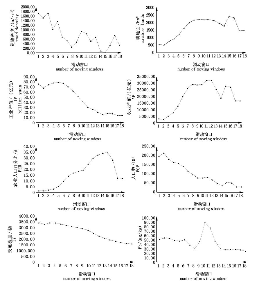 最后,以上述插值所得的空间分布图,在每个滑动窗口内采用区域统计方法(zonal statistics)计算道路密度(road density,RD)、交通量(TV)、AL、POP、IP、AP以及PFP等社会经济指标变量和Pb的平均值。