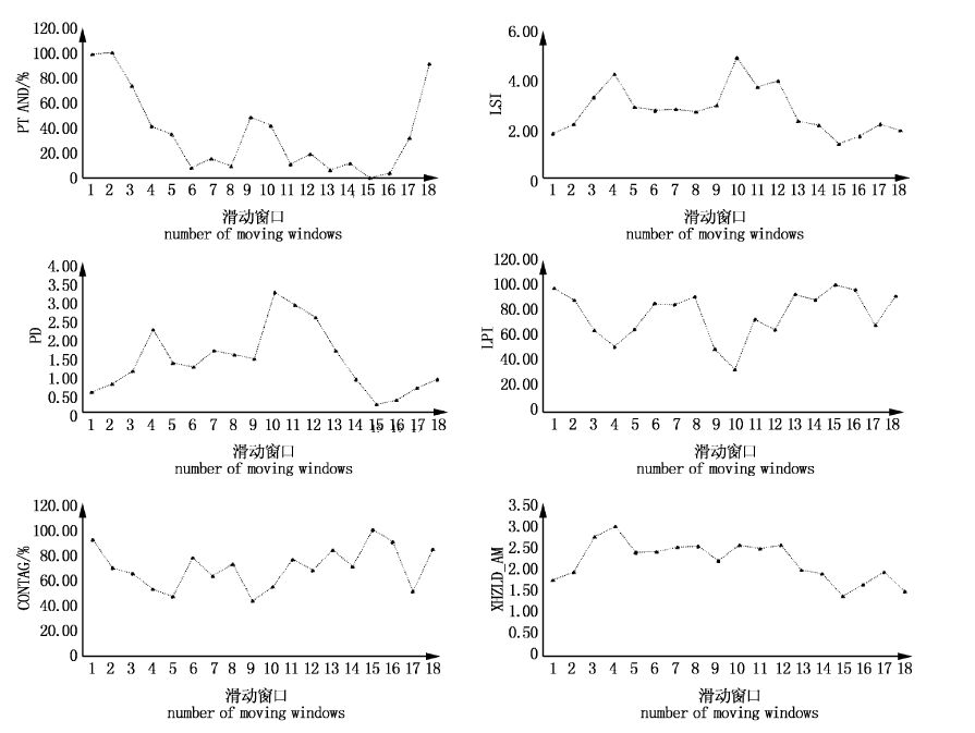 建筑用地面积(PLAND)从市中心逐渐降低,而在临港新城区域又大幅上升。这与自2003年以来临港新城的快速发展有关。在城乡梯度的中部,第10个滑动窗口的位置,即宣桥、康桥一带,景观形状指数(LSI)和斑块密度(PD)出现峰值。最大斑块指数(LPI)和蔓延度指数(CONTAG)在靠近郊区处出现峰值。形状加权指数(SHAPE_AM)先增加,然后总体上自北向南逐渐降低(图3)。