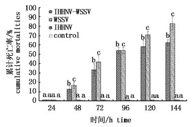 WSSV感染24 h以后,感染组对虾相继出现发病和死亡情况,临床表现为红体、停食、水面漫游和头胸甲内面白点,而IHHNV组和control组对虾未出现以上特征,也没有出现死亡现象。累计死亡率分析显示(图1),WSSV感染组和IHHNV-WSSV共感染组的对虾随着感染时间的延长累计死亡率都逐渐升高,而且WSSV组对虾的累计死亡率始终高于同期IHHNV-WSSV组。至WSSV感染后144 h实验终止时,WSSV组对虾的累计死亡率(83.3%±6.8%)约为IHHNV-WSSV组(62.5%±3.4 %)的1.3倍。