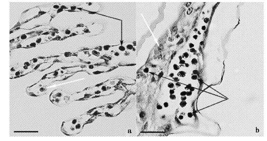 a. IHHNV-WSSV组对虾鳃丝; b. WSSV组对虾鳃丝。黑色箭头指向病毒感染的细胞,白色箭头指向正常细胞。标尺=20 μm。 a. Gills of P. vannamei in the group of IHHNV-WSSV; b. Gills of P. vannamei in the group of WSSV. The black arrows point to virus-infected cells,the white arrows point to normal cells. (H&E). Bar=20 μm. |