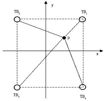 图1 位置测量系统 TD1-TD4为声波接收器,P点为跟踪的标志。the TD1 - TD4 for acoustic receiver,point P as a sign of the trace. Fig.1 Positioning system |