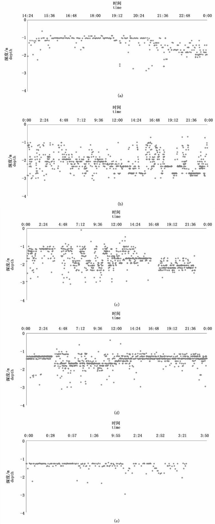 花尾胡椒鲷深度接收数据由2014年11月5日14:20起至11月9日3:20为止,深度变化如图2所示,图2中(a)-(b)分别为11月5日-9日深度分布图。从5 d的整体趋势看,当花尾胡椒鲷放流后在前5个小时内一直在中上层水域,主要原因是花尾胡椒鲷刚刚经过麻醉与手术,身体机能未完全恢复以及处于新水域环境,因此未进行大范围上下游动。结合水平数据会发现,此过程中花尾胡椒鲷的水平游动也仅在几米范围内。随后的观察中花尾胡椒鲷在中层水域进行上下游动,具体分析如下。