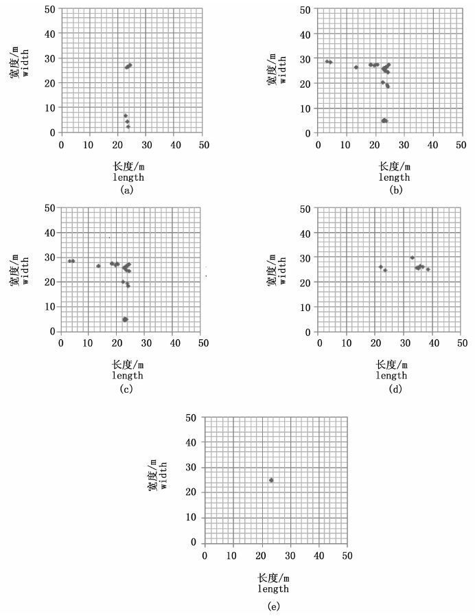 2.2 水平变动分析图3所示为花尾胡椒鲷连续5 d的水平位置分布。本文对水平分布数据进行简单分析,超声波标志发射信号同时被4个接收器接收,将这些接收信号处理后得出水平数据,然后根据实际实验池的大小去除偏差数据,最后剩余的为有效水平数据。实验中存在少量干扰信息,主要由接收器距离池壁较近,受多路径波的干扰引起。