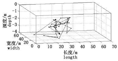 2.3 三维位置变化图4所示为花尾胡椒鲷连续5 d的三维位置变化图,由于已有深度与水平数据部分在时间上存在差异性,需要选择同一时间下水平与深度数据作为有效三维数据。另外,本次实验数据采用编程来选取4个直接波,由于水池中多路径波较多,手动选取效果会更好。如图4所示,花尾胡椒鲷运动轨迹仅限于实验池中部,基本不向池壁游动,主要活动范围为中间水层,且活动范围较小,摄食时由原始路线返回,深度降低。
