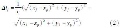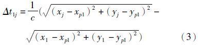 水平坐标的测位方法中,根据长基线测位法(接收器之间的距离要远大于声波的波长),使用标志发出声波到达各个接收器之间的时间差来进行计算。如图1所示,假设标志P点的坐标为P(xp,yp),接收器的坐标为TDj(xj,yj)(j=1-4),标志P点到达接收器TD2、TD3和TD4的时间与到TD1的时间差为: