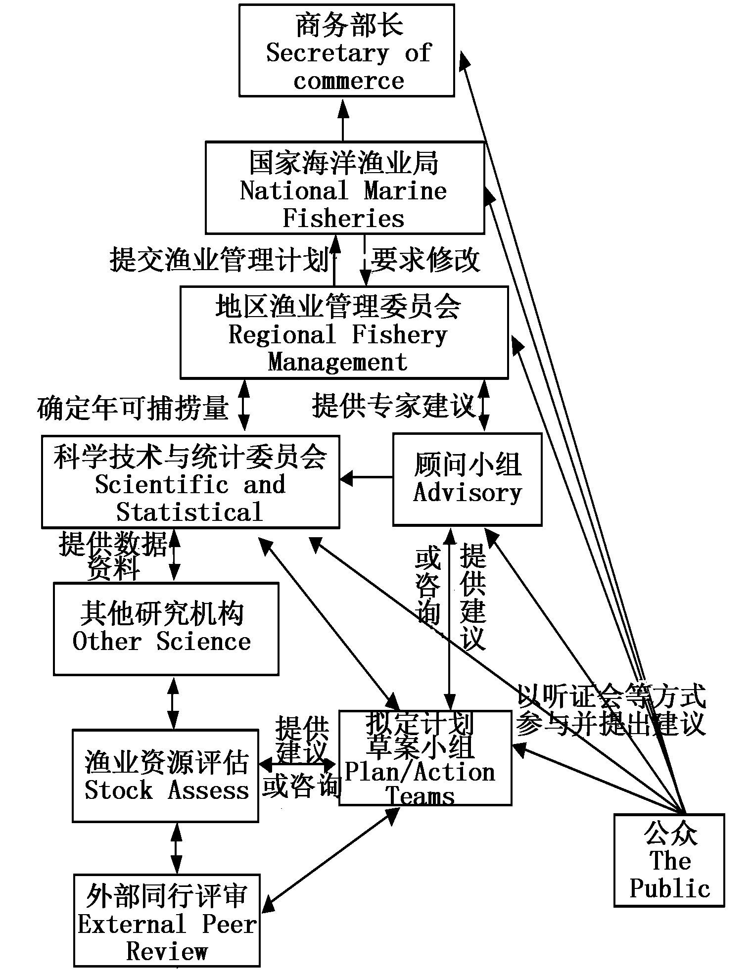 2 地区渔业管理委员会的职能、组织和决策程序 2.1 地区渔业管理委员会的职能MSA立法目标是把捕捞量控制在最佳产量(Optimum Yield),控制外国渔船捕捞量,防止过度捕捞造成的渔业资源衰退,恢复过度捕捞的种群,保护本国商业性捕捞和游钓渔业[16]。为了便于管理,将美国的沿岸水域分成2个部分:州水域——自领海基线至3海里内,联邦水域——自3海里外至200海里,将联邦管辖水域划分为8个渔业区,每个区涵盖沿海几个州,并成立了渔业管理委员会,即:新英格兰区渔业管理委员会(New England Fishery Management Council)、中大西洋区渔业管理委员会(Mid-Atlantic Fishery Management Council)、南大西洋区渔业管理委员会(South Atlantic Fishery Management Council)、加利福尼亚区渔业管理委员会(Caribbean Fishery Management Council)、墨西哥湾区渔业管理委员会(Gulf of Mexico Fishery Management Council)、太平洋区渔业管理委员会(Pacific Fishery Management Council)、北太平洋区渔业管理委员会(North Pacific Fishery Management Council)和西太平洋区渔业管理委员会(Western Pacific Fishery Management Council)。